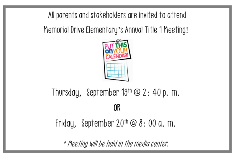 Please join us for our Annual Title I Meeting on Thursday, September 19th at 2:40 pm or Friday, September 20th at 8:00 am.