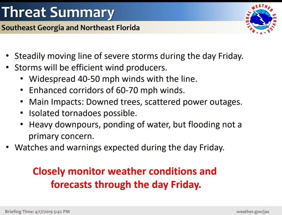 Due to the enhanced chance of high winds, tornadic activity, downed trees, and power outages, all Ware County Schools and the Central Office will be closed on Friday, April 19, 2019. Staff will not be required to report. Safety remains our top priority.
