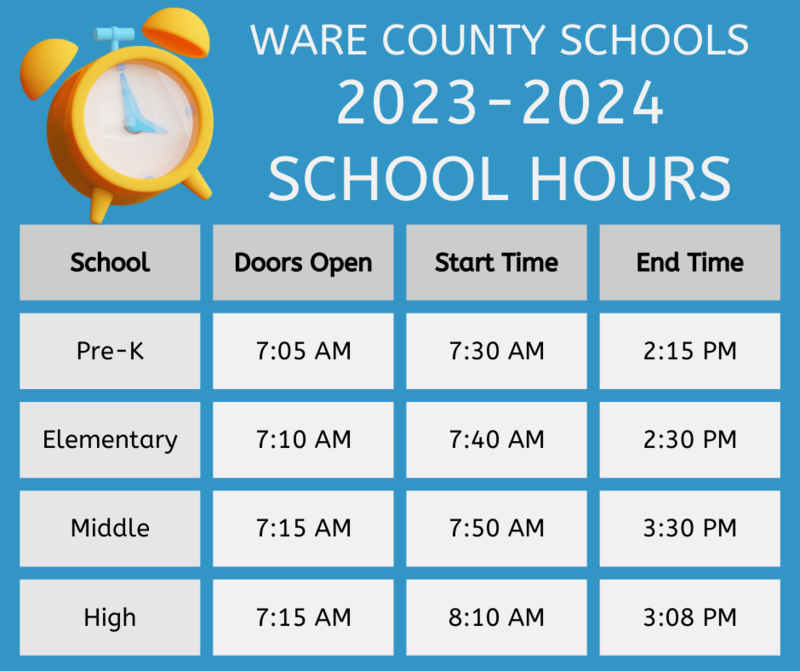 Ware County Schools is releasing its school hours for the 2023-2024 school year so you can begin planning for your family. See the graphic for more details!