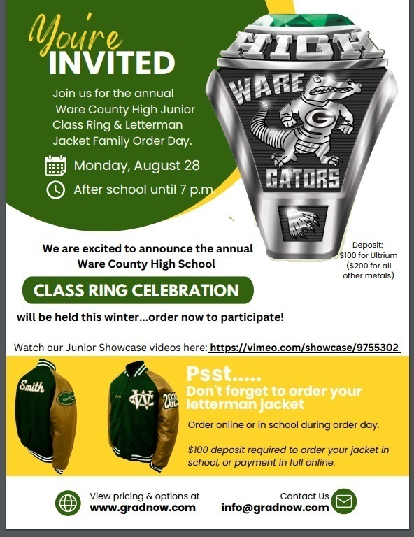 The annual Ware County High junior class ring & letterman jacket family order day will be held on Monday, August 28 from after school until 7:00 p.m. See flyer for more information.